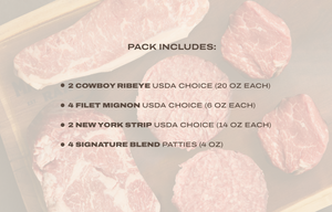 A bold intro to the best of MHR. This all-protein bundle features 2 Cowboy Ribeyes (20oz), 4 Filet Mignons (6oz), 2 New York Strips (14oz), and 4 Signature Blend Patties (4oz). Premium cuts, no fillers—just pure flavor.
