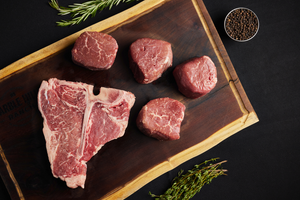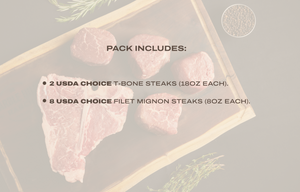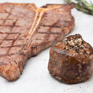 Indulge in the ultimate steak experience with our Classic Duo Package. This bundle offers the perfect combination of bold, beefy flavor and melt-in-your-mouth tenderness. With the rich marbling of the T-Bone and the juicy texture of the Filet Mignon, this selection is ideal for any special occasion or family gathering.