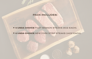 Indulge in two of the most tender and flavorful steaks with our Filet & Strip Package. Whether you're in the mood for the delicate tenderness of the Filet Mignon or the bold, beefy flavor of the New York Strip, this package offers the perfect variety for any steak lover.